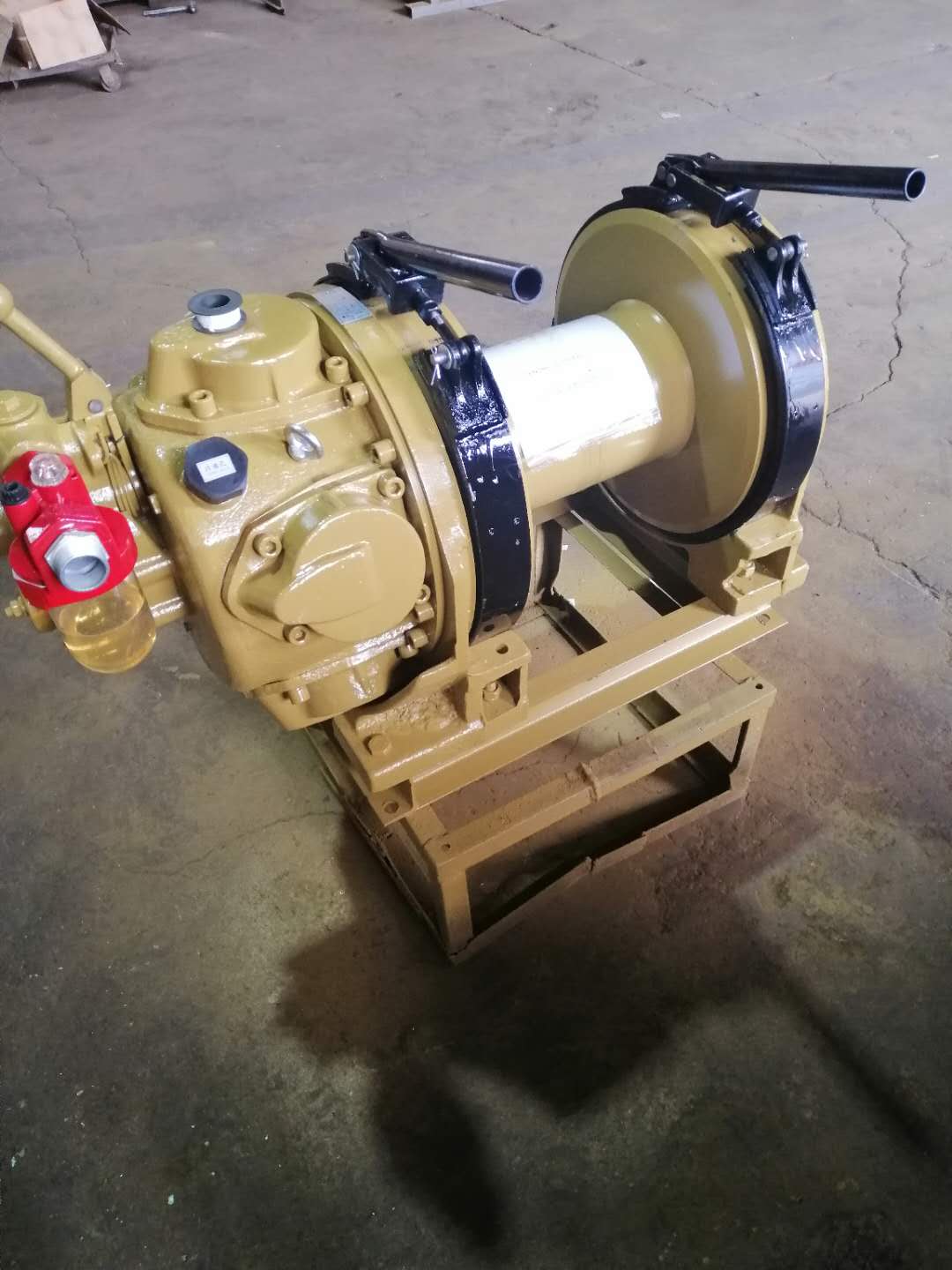 絞車(chē)由馬達(dá)總成(氣動(dòng)機(jī))、制動(dòng)器總成、減速機(jī)構(gòu)、卷筒、機(jī)座等主要部分組成。